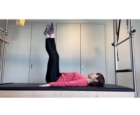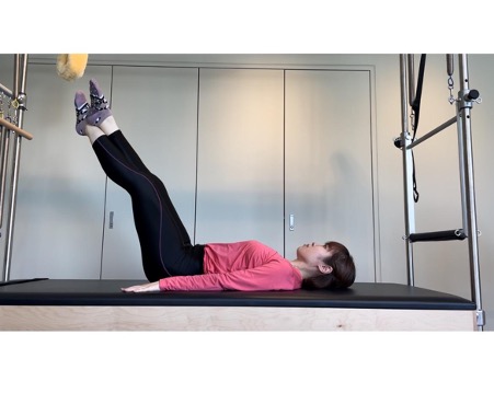 ②背骨全体をしっかり床に預けた状態で吸いながら脚を遠ざけていきます。