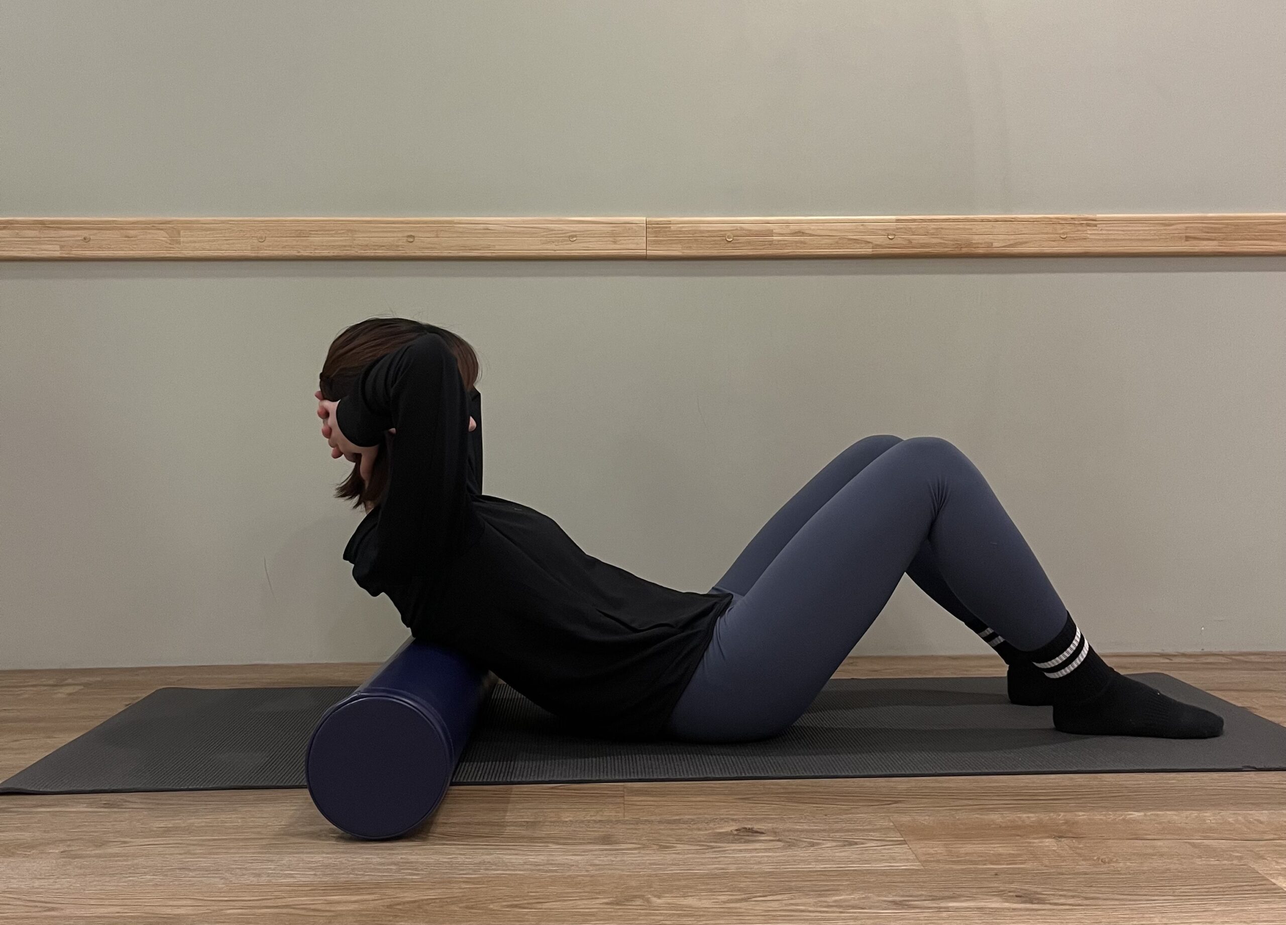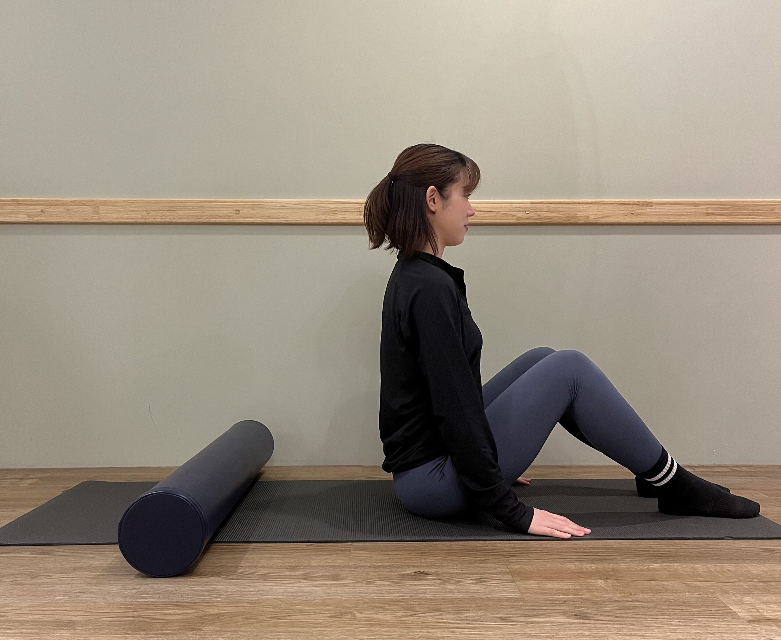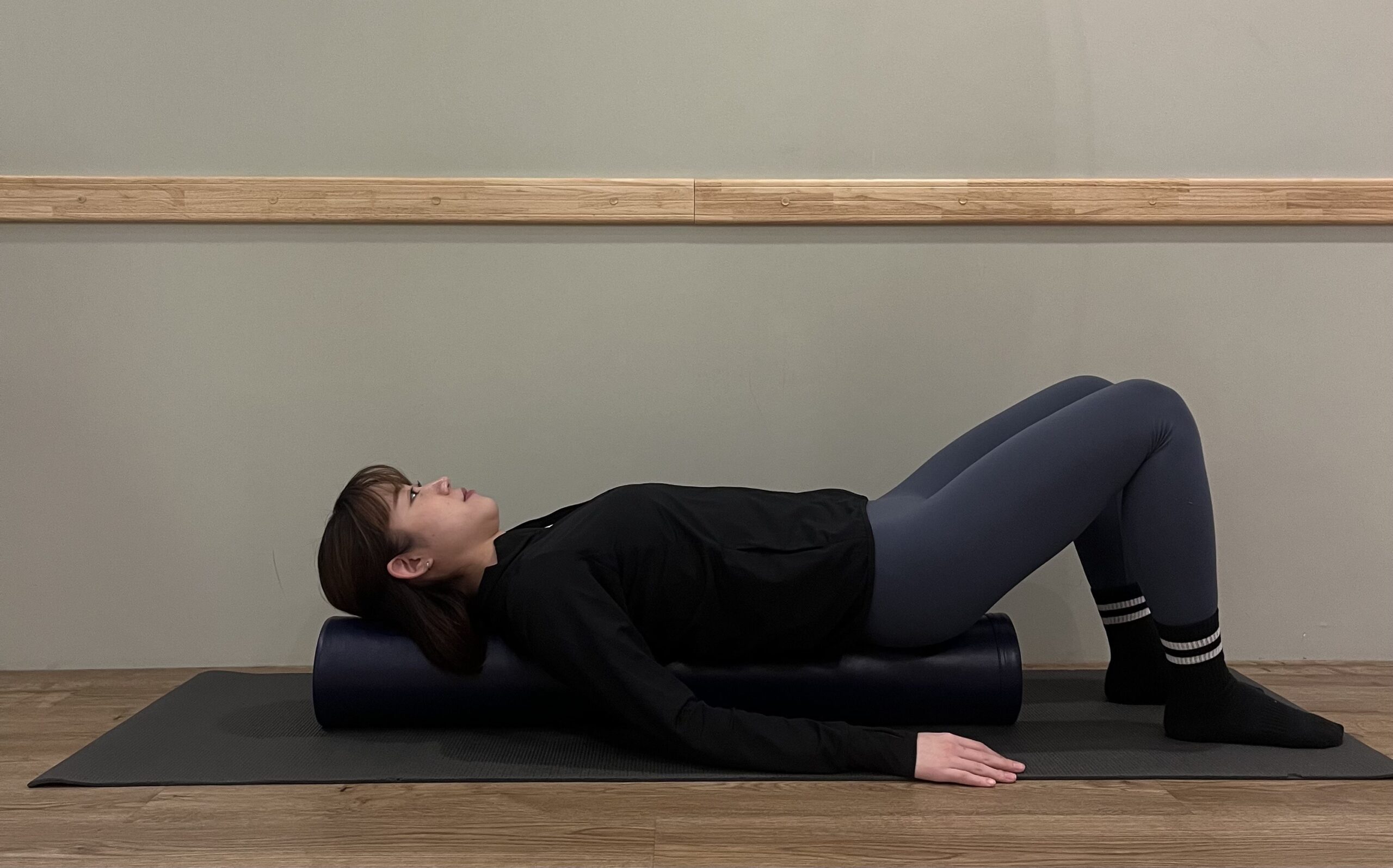 ストレッチポールに頭からお尻まで乗るようにし、骨盤・背骨・後頭部がまっすぐ乗るようにしましょう。