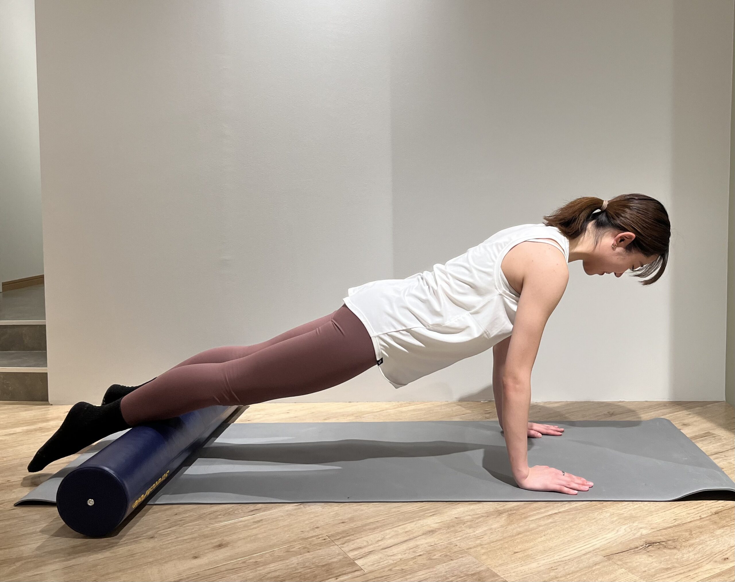 動いている間中、ポールが転がらないように足裏は床の方に押し続けたまま(またはお尻の方に引くイメージで)ブリッジするのがポイントです。