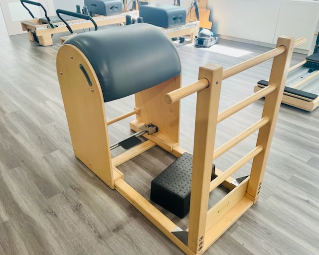 スタジオのプライベートレッスンで、様々なポジションでストレッチをするのに使われるバレル。
