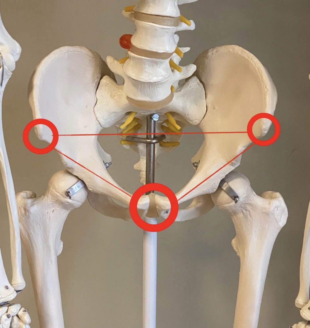 「写真の○3点(左右の骨盤のゴリゴリした骨ASISと、恥骨)