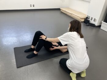 ポイントは、同じピラティスを勉強する仲間に対してではなく、友人や家族などピラティスをあまり知らない方に指導練習をするという点。