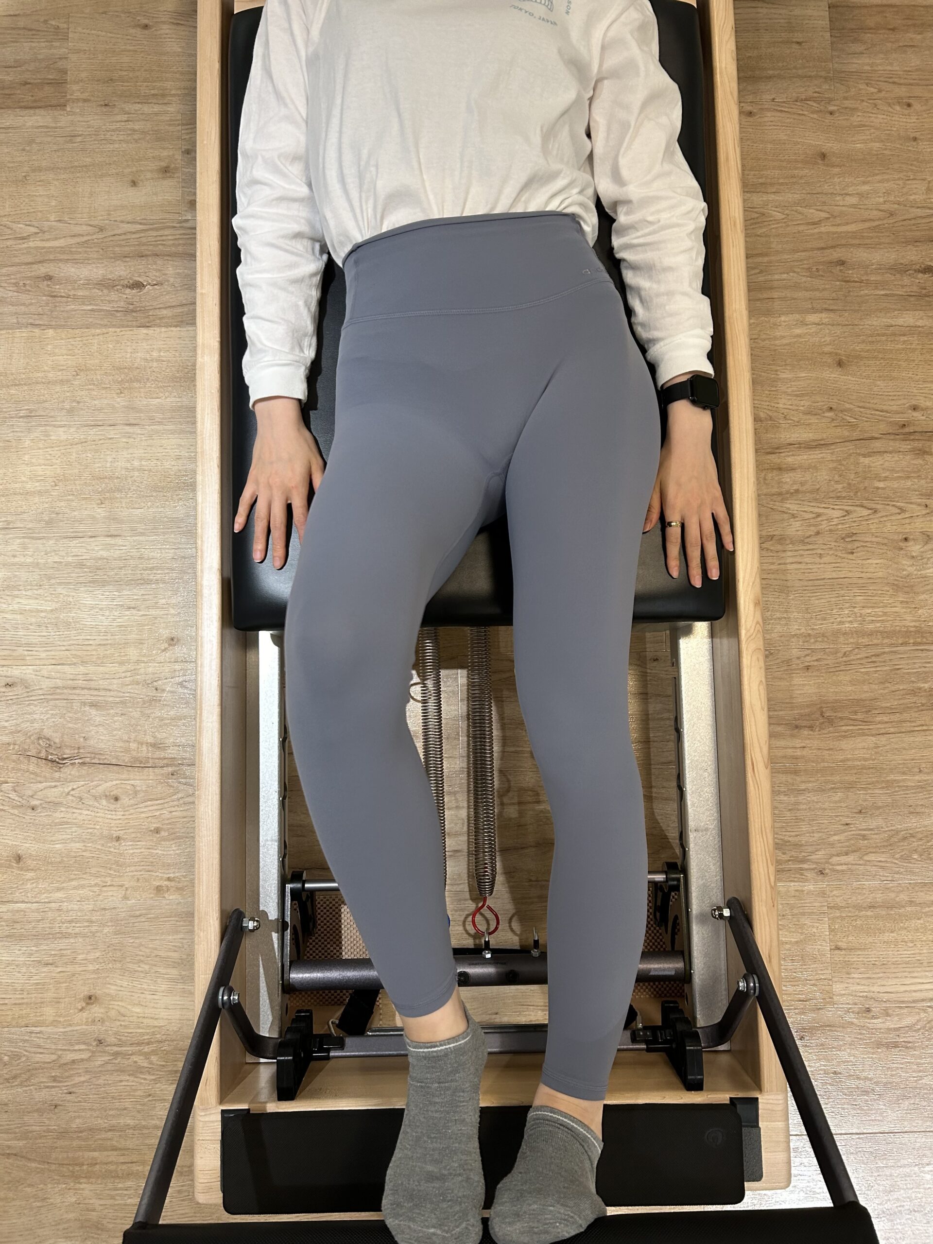 この動きをリフォーマーで行うことのメリットは、仰向けで寝る事で正しい骨の位置が分かりやすくなるという点です。