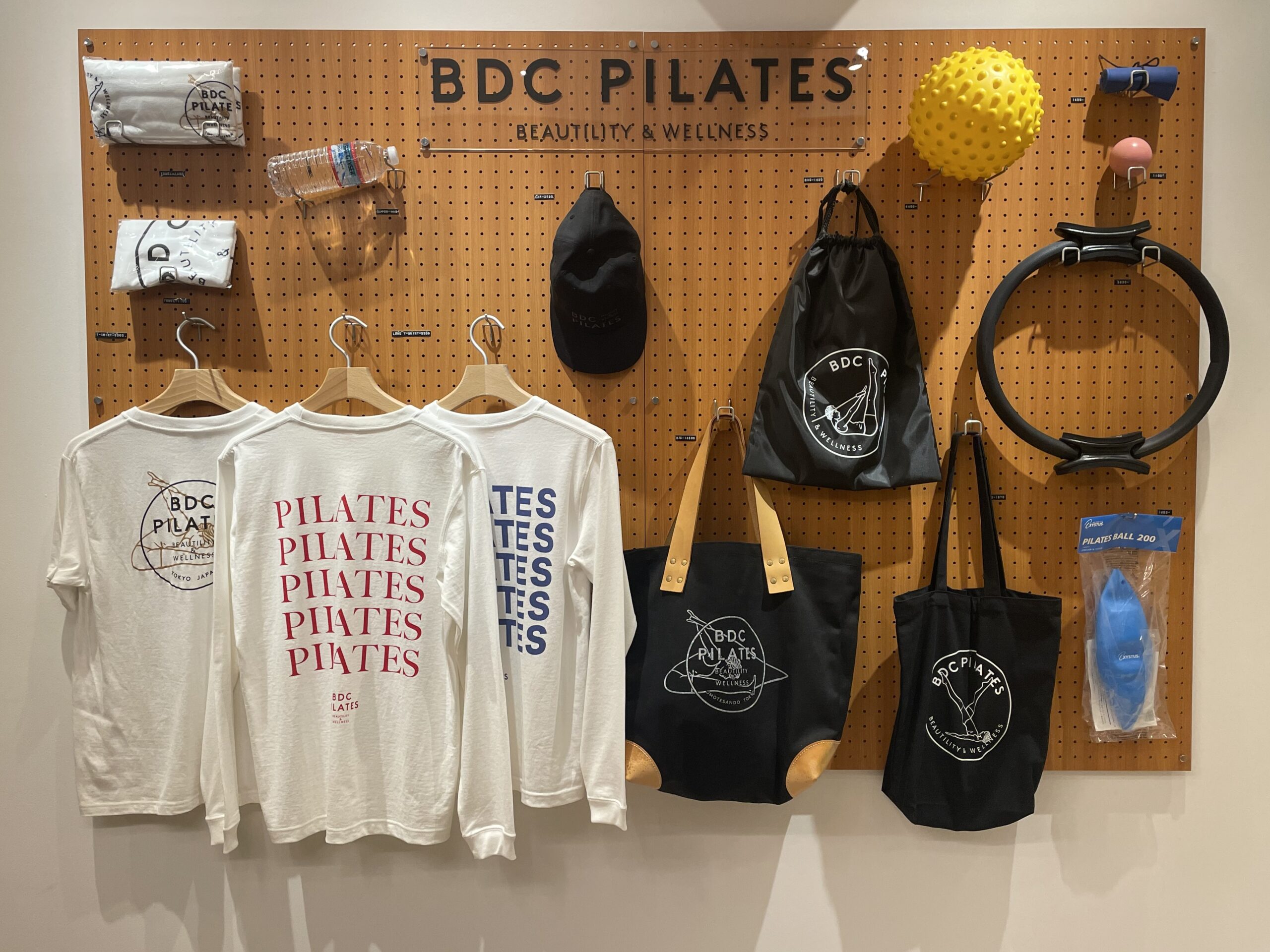 スタジオに入ってすぐには、エクササイズで使える道具(プロップ)や、Tシャツ、バッグ、靴下などの商品も飾っておりますので、ぜひご覧ください♪♪