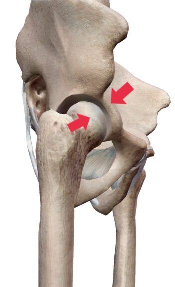 変形性股関節症の場合は、股関節(球体)と骨盤の隙間がなくなり(下の図の赤矢印)股関節に炎症がおきます。