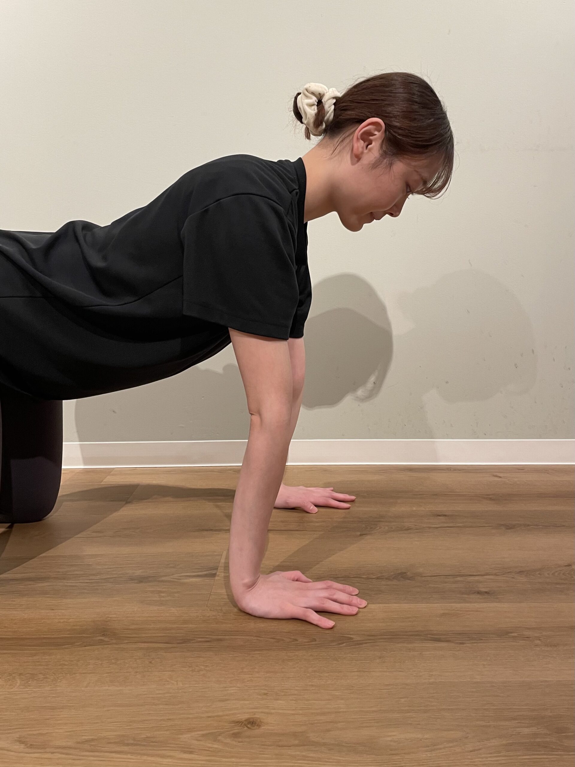 肘が過伸展にならず、脇からしっかり床をプッシュできていれば、肘や手首は痛くならないので、チェックしながら少しずつ練習をしてみましょう。