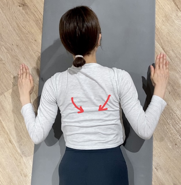 僧帽筋下部を働かせて、肩甲骨が斜め下の背骨に集まることも意識しましょう。