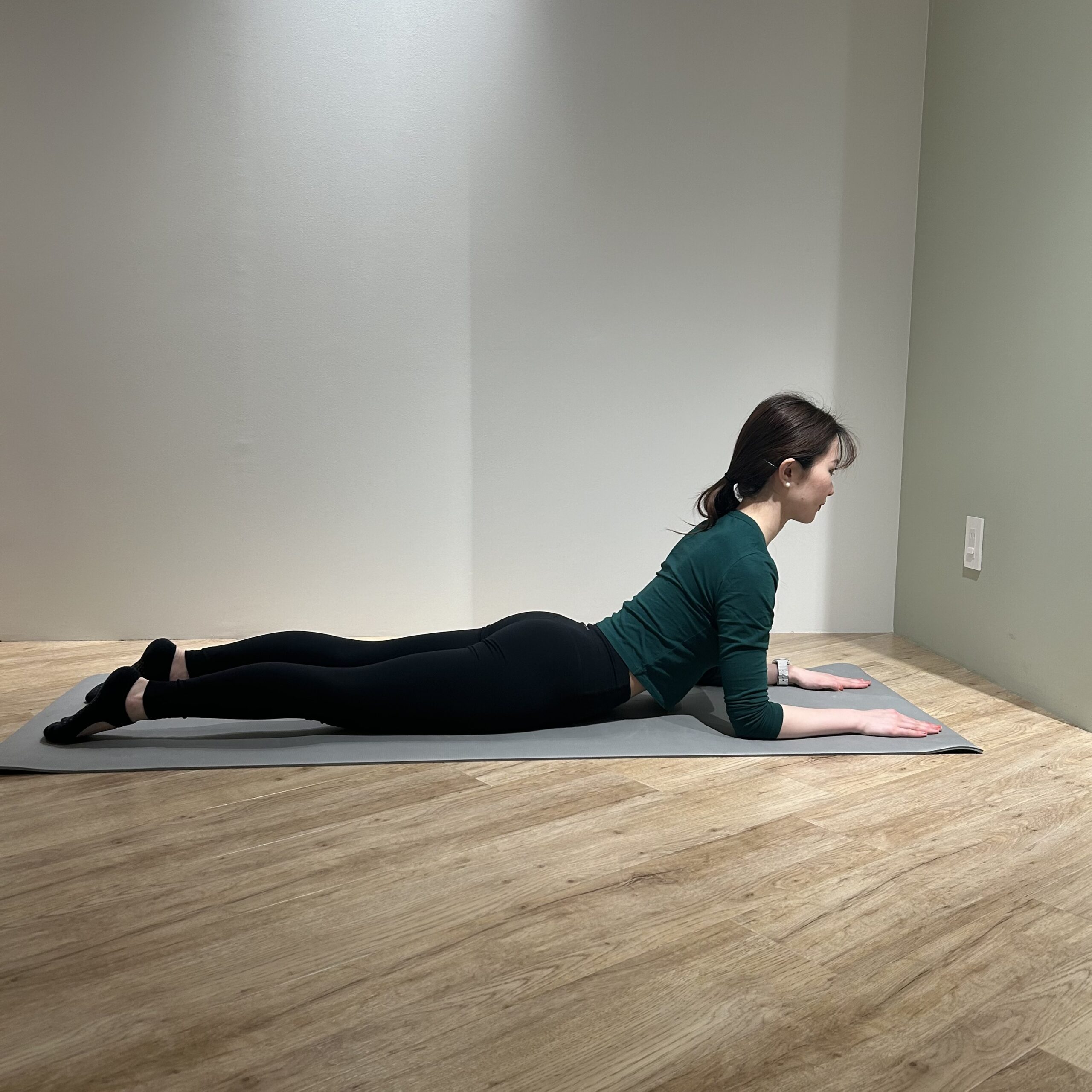 両肘を曲げて肩の真下に肘がくるように手のひらと前腕をマットに置きます。