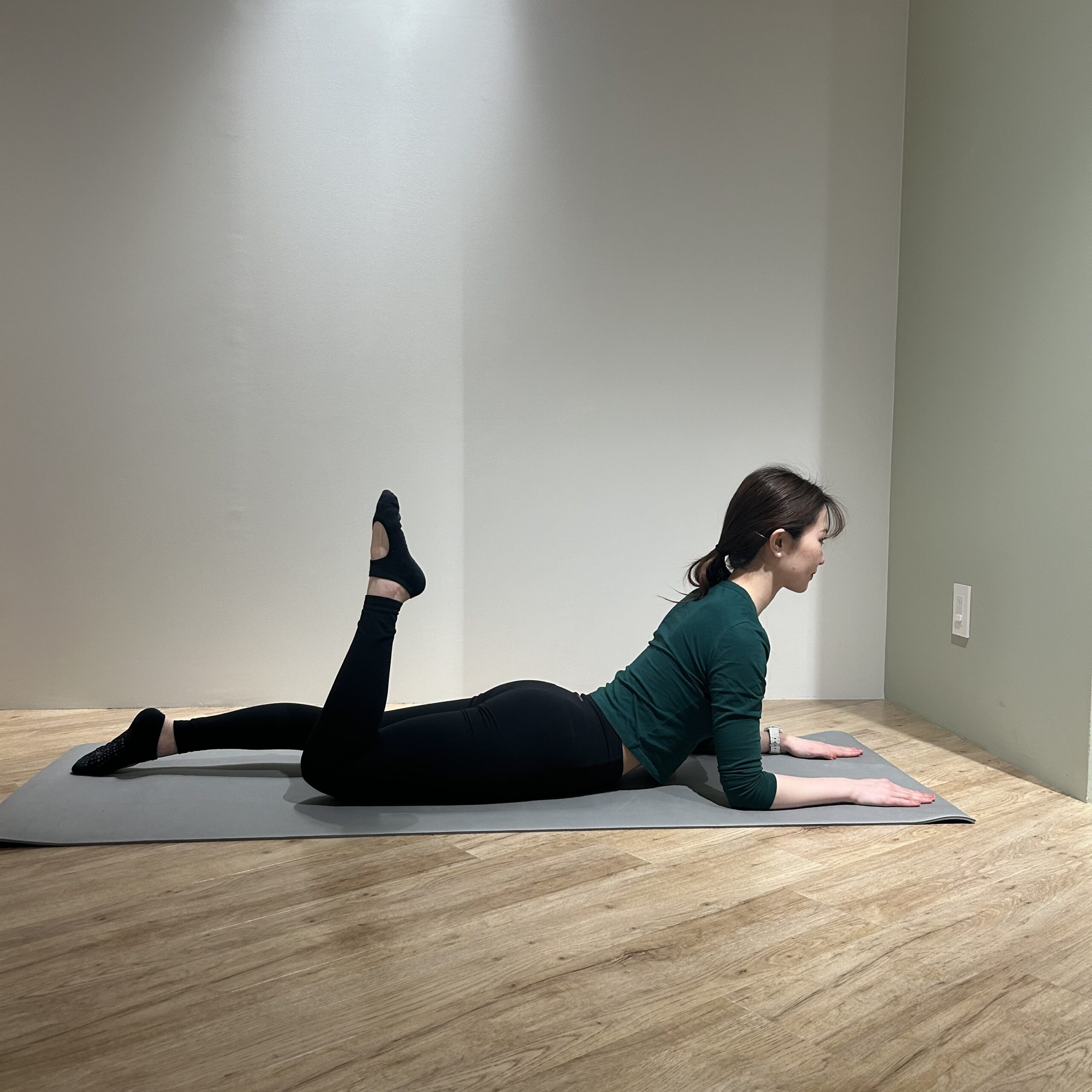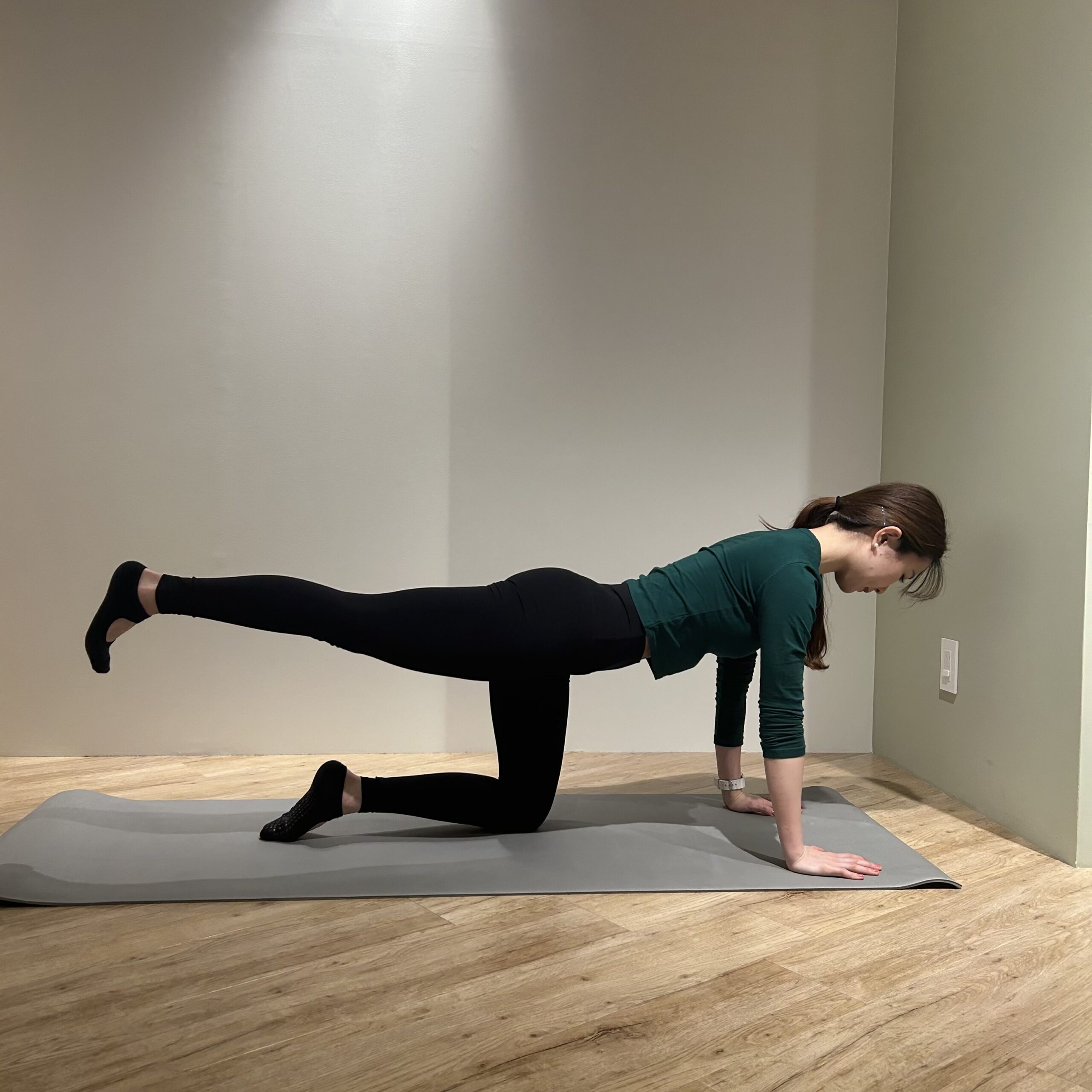 胸と頭の高さを揃えたまま、右脚をお尻の高さに伸ばします。