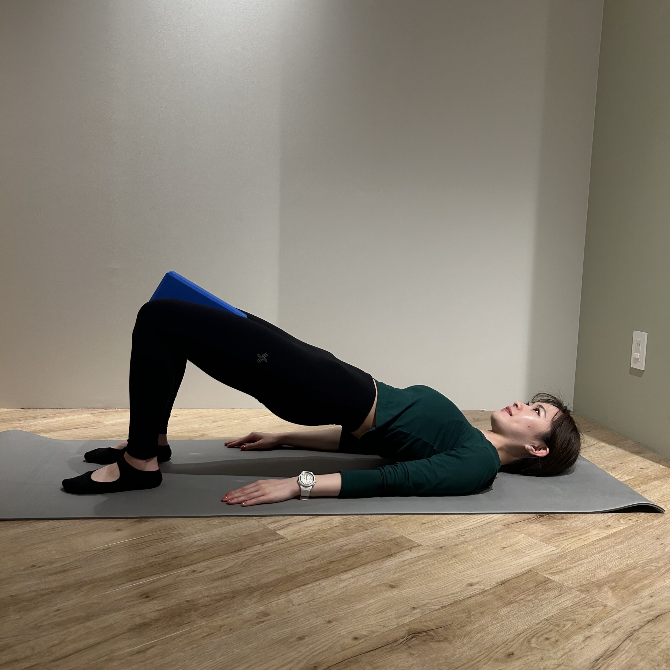 肩甲骨はついたまま肩から膝まで一直線の状態で、膝が開かないようにしっかりとブロックを挟みます。