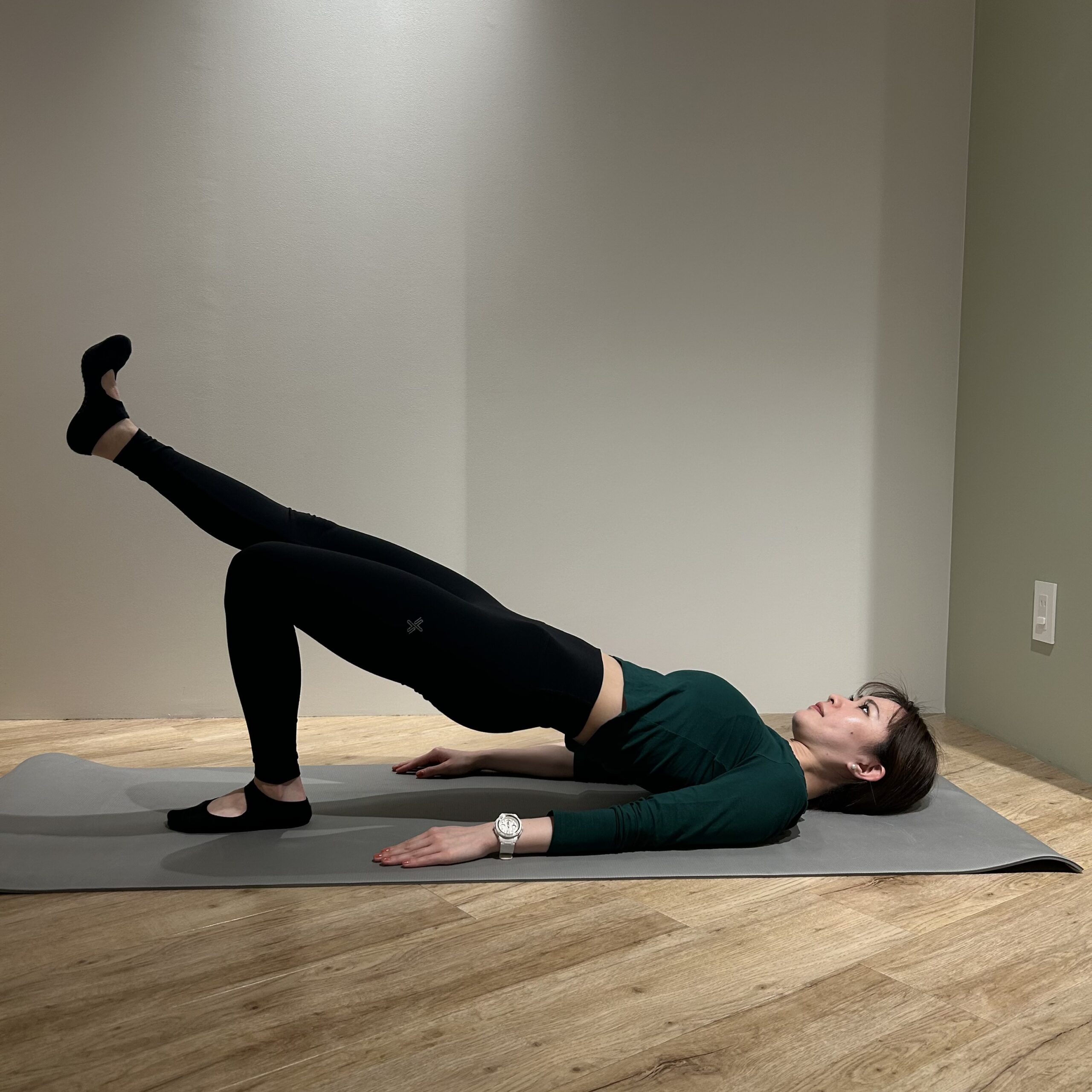 先程の②のブリッヂをブロックなしで上がった状態から、吸う息で足首を伸ばしながら左脚を天井へ伸ばします。