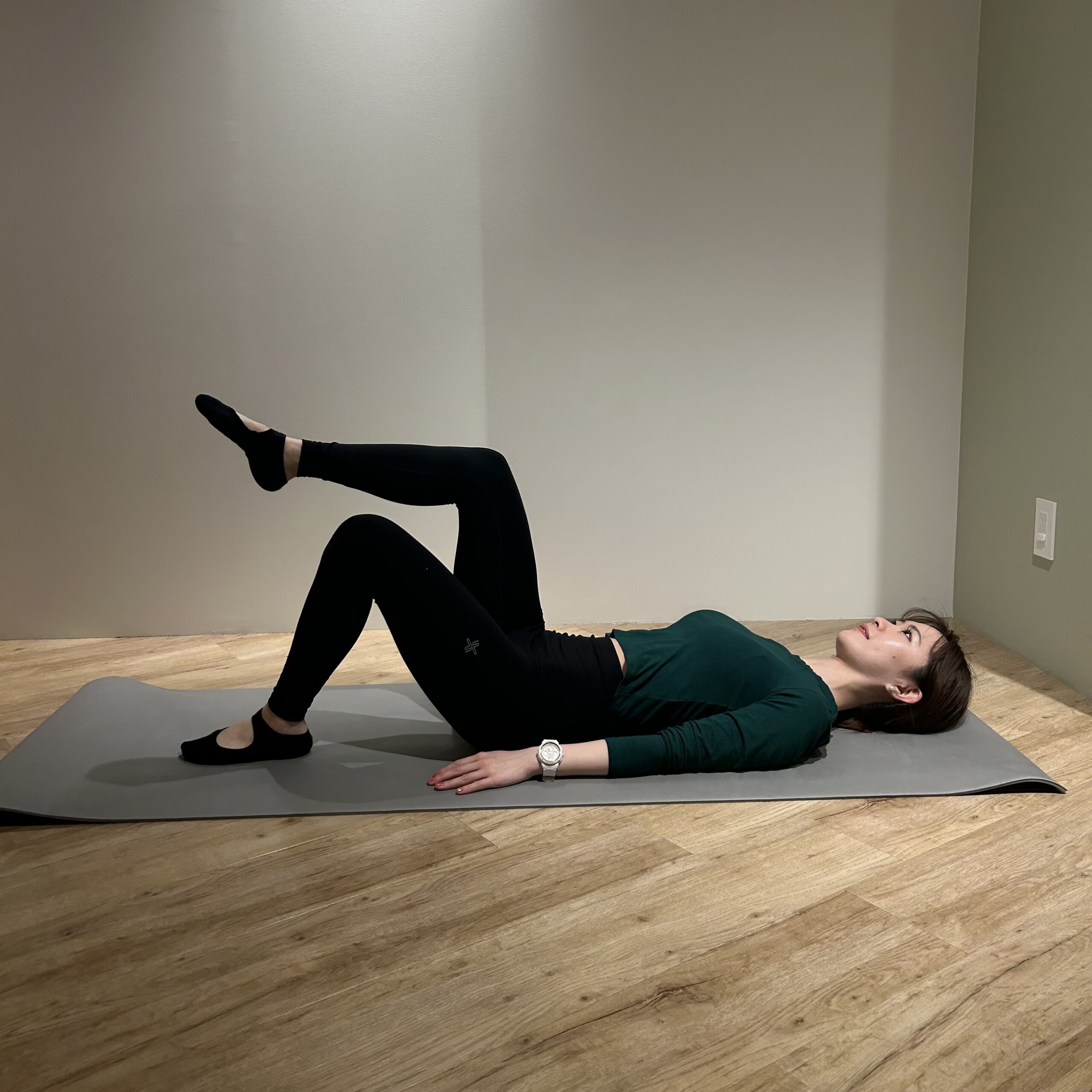 両膝を立てて仰向けになり、骨盤のニュートラルポジションをキープした状態で、吐く息で右脚を90度持ち上げ、ももの骨を垂直、すねは床と並行(テーブルトップポジション)にする。
