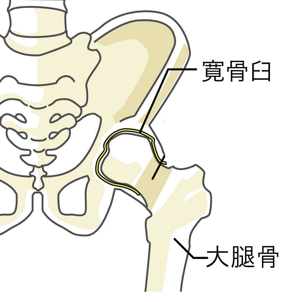 「股関節」は上の図のように太ももの骨(大腿骨)の先端にあるボールの形をした骨と、骨盤側で受け皿になるお椀の形をしたソケット(寛骨臼)との組み合わせでできています。