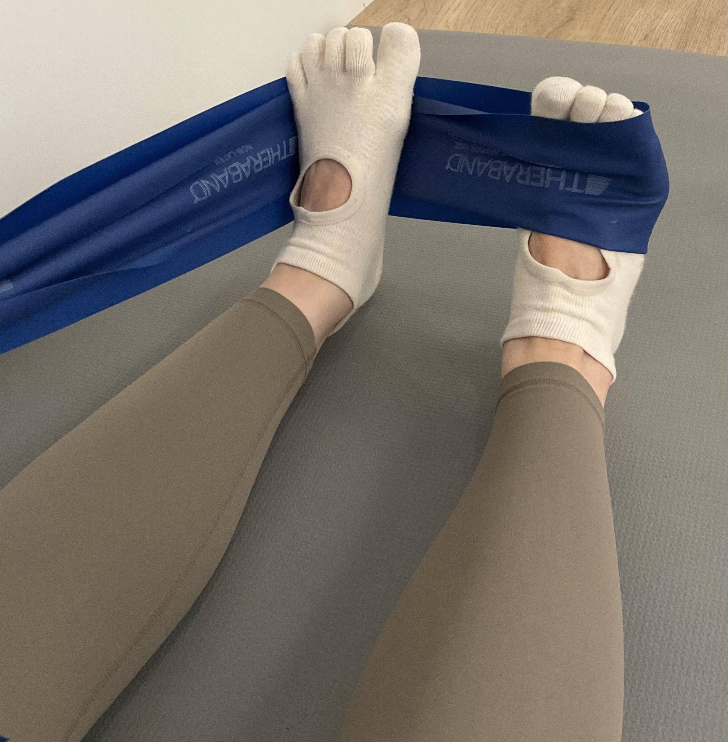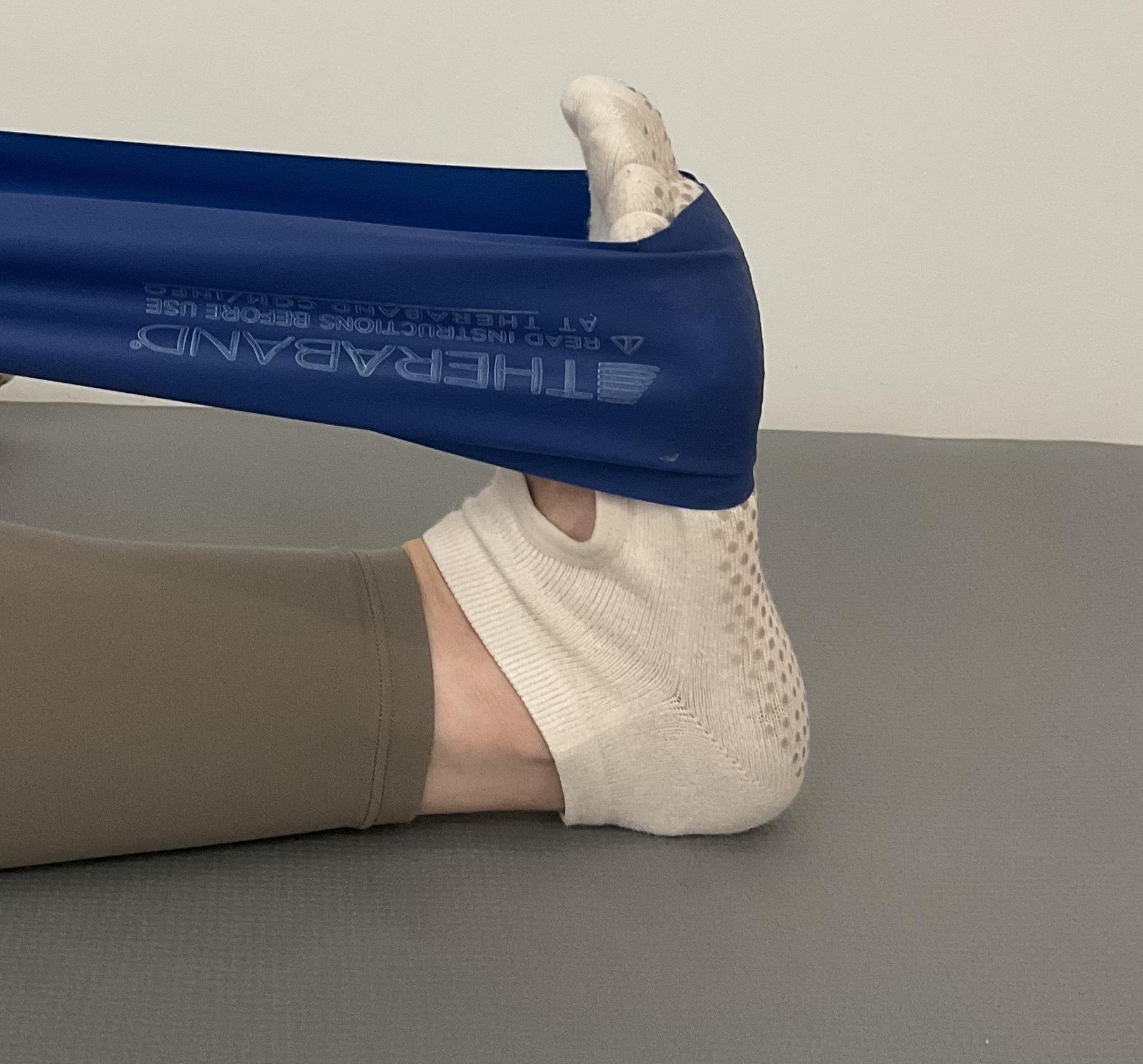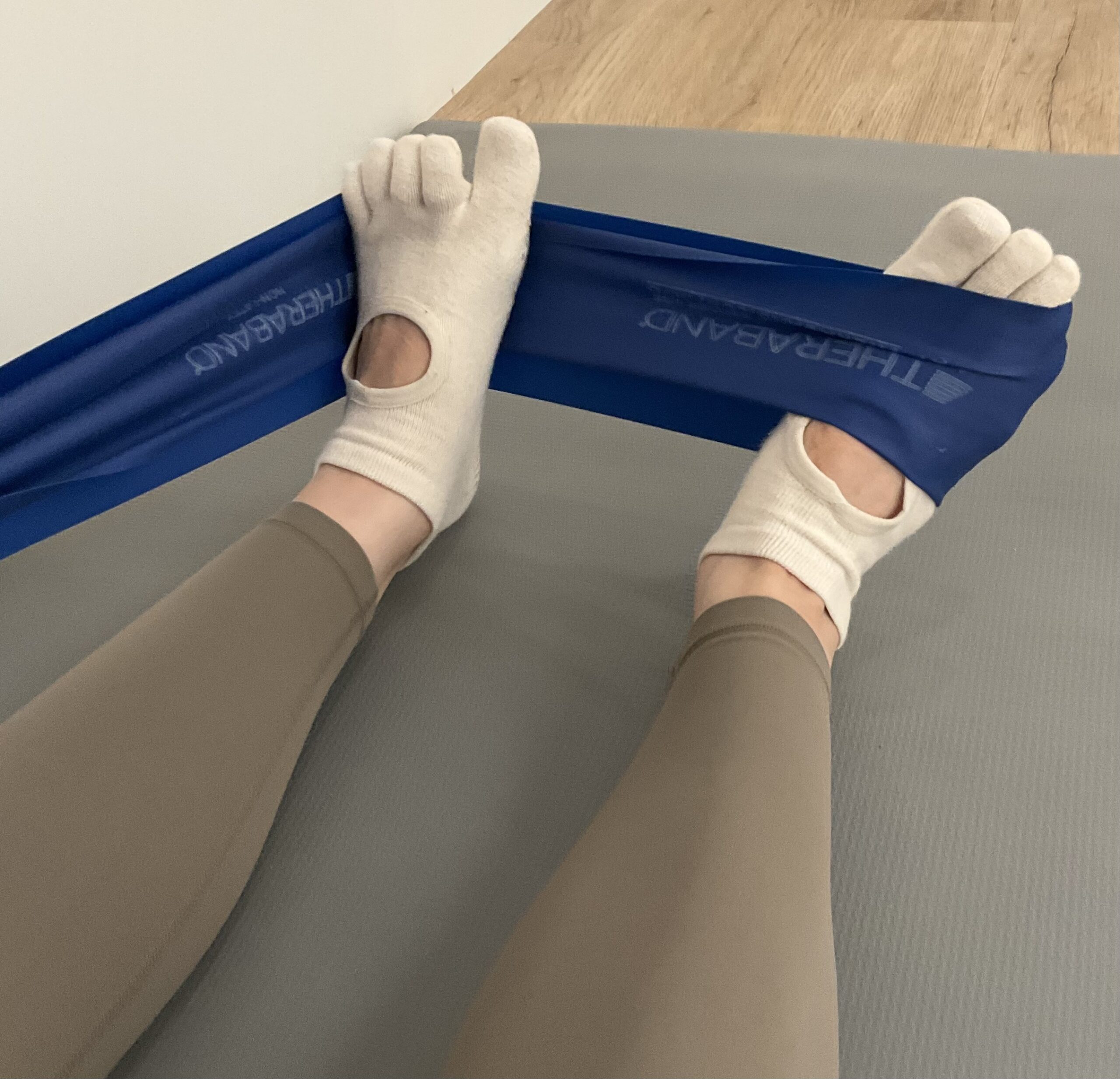 次は、片脚にゴムを引っ掛けてもう一方の足裏でゴムをピンと貼ります。足首はなるべく90°に曲げておきましょう。