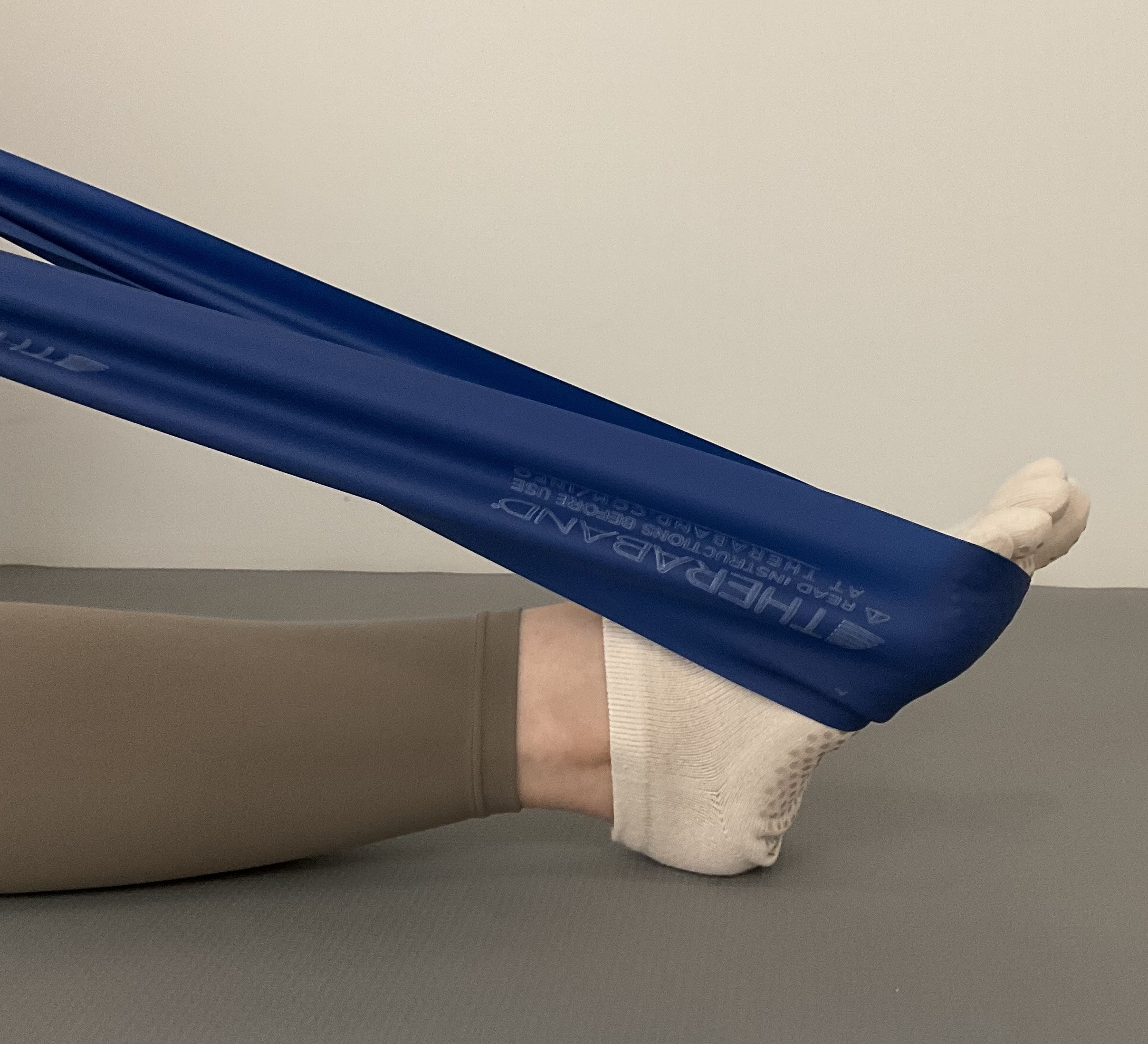 ゴムを手前に引っ張り続けながら、足首を曲げる・伸ばすの動きを繰り返します。