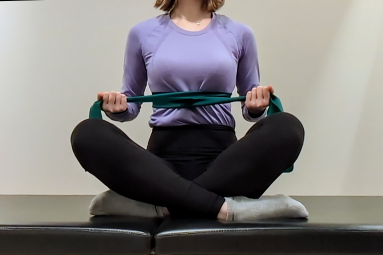 1. あぐらで座り、肋骨の周りにバンドを巻く。