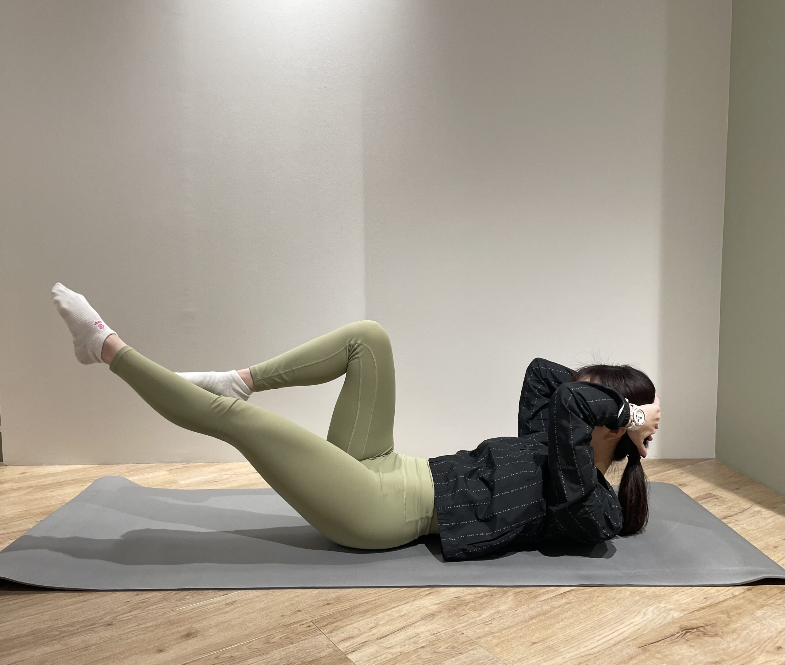 上体をカールアップした(起こした)状態で、片足を伸ばし、片膝を引き寄せる動きです。