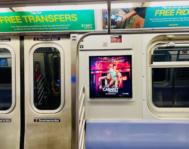 地下鉄の車内のデジタル広告に、Broadwayミュージカル”Cabaret” (キャバレー)のキャスト写真が出ていました。