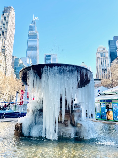 マンハッタンのミッドタウンにあるブライアント・パークでは噴水も凍り、まるでアートのよう。